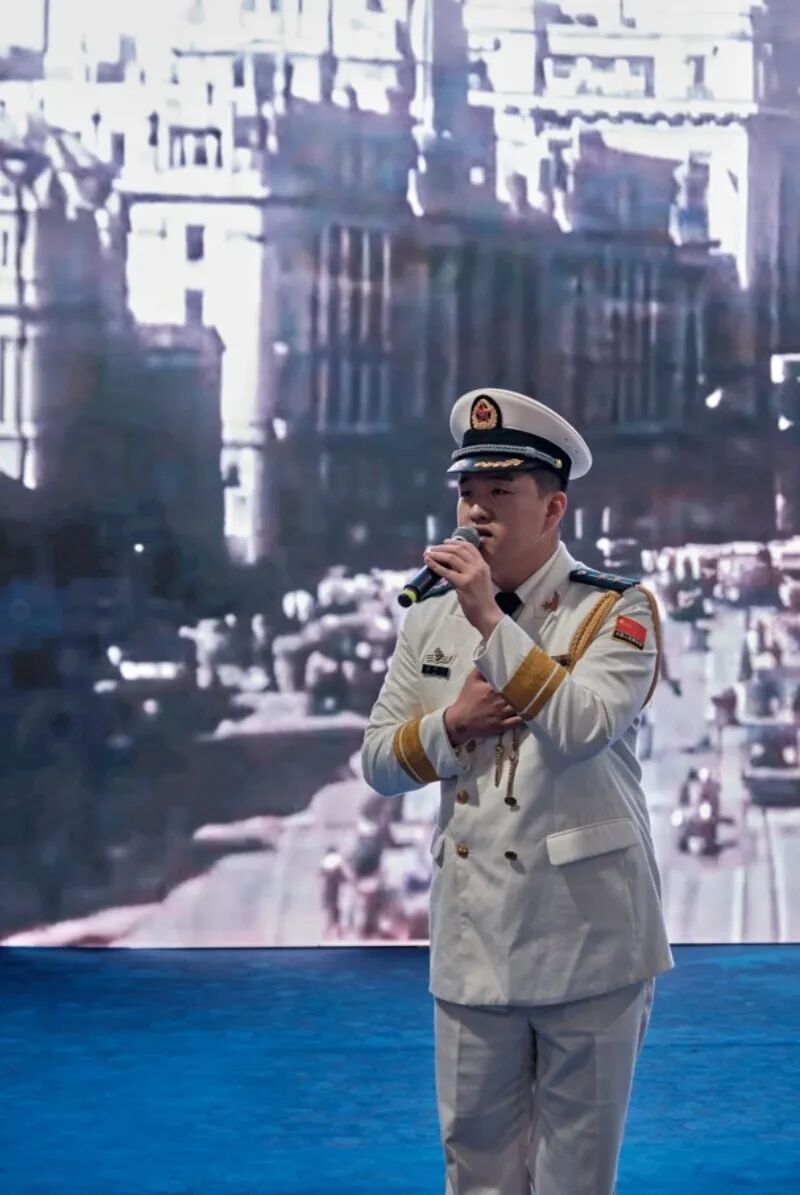与就在市中心的北外滩不同,吴淞口从检票点到码头有相当的距离,因此需要乘坐摆渡大巴。而在吴淞口码头入口处迎接参观人群的,是一个巨大的LED舞台以及一名文工团的同志,每来一波观众就献唱一首海军歌曲,还带着大家一起唱。由于夜间内部场的参观人员很多都是海军家属,因此能跟着唱的人还挺多。