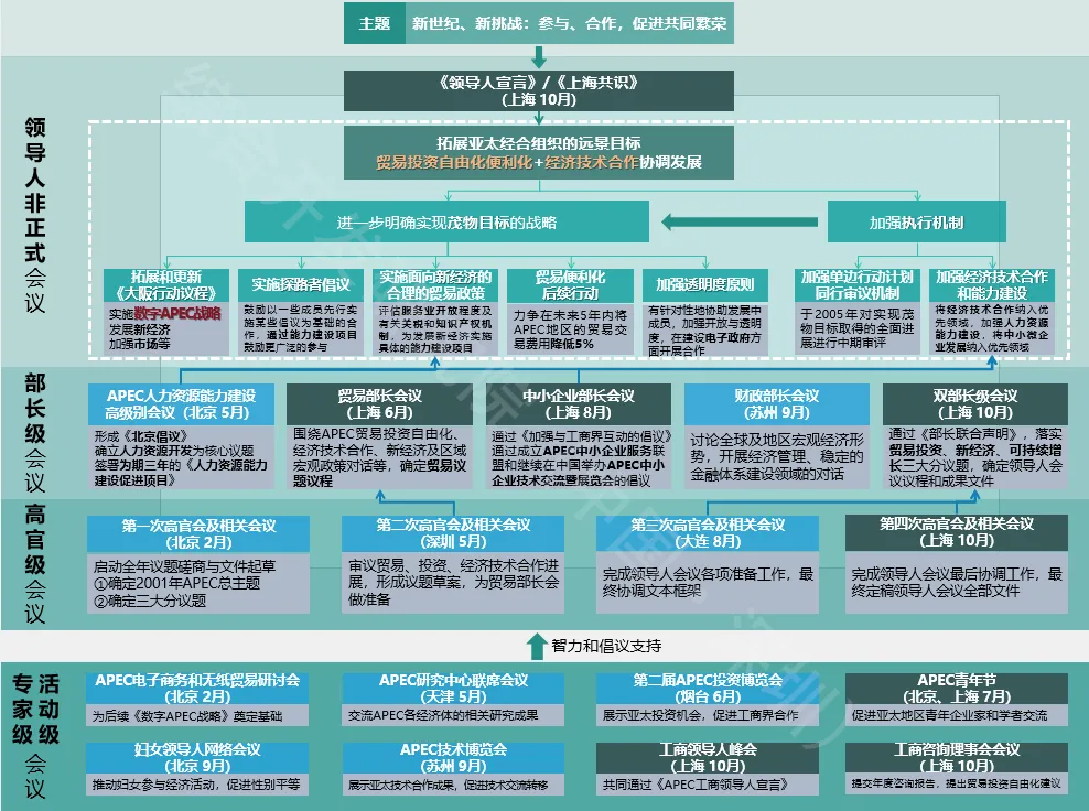 围绕着共商确立的“新世纪、新挑战:参与、合作,促进共同繁荣”会议主题,2001年经过高官会、部长级会议等预备会议后(年度会议体系和中国筹备组织机制见附件),在10月的领导人非正式会议上通过了《领导人宣言》,将1994年的“茂物目标”和1995年的《大阪行动议程》进一步深化为“上海共识”,为APEC在第二个十年及以后的发展指明了道路。