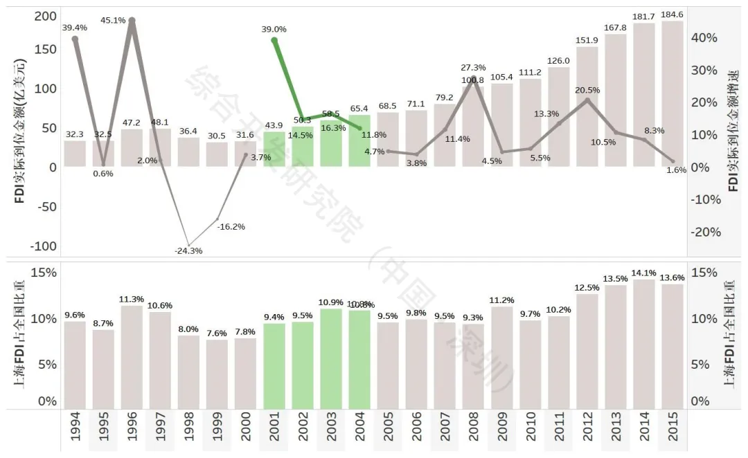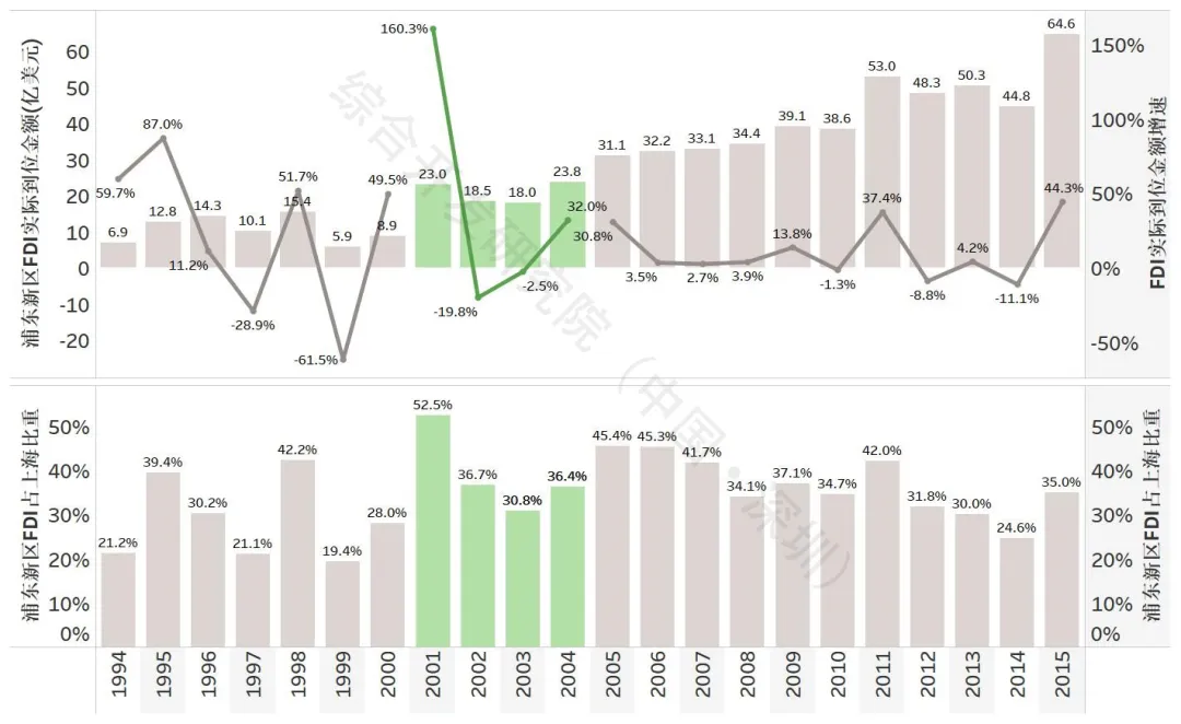 图5 2001-2004年上海及浦东新区FDI规模及增速、占比情况