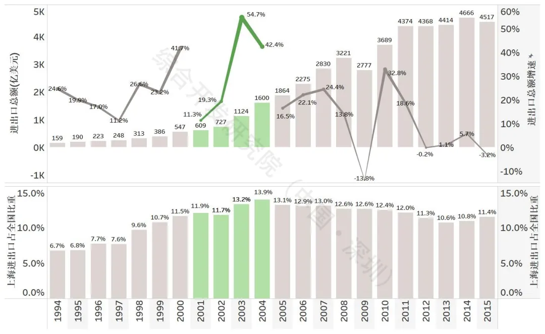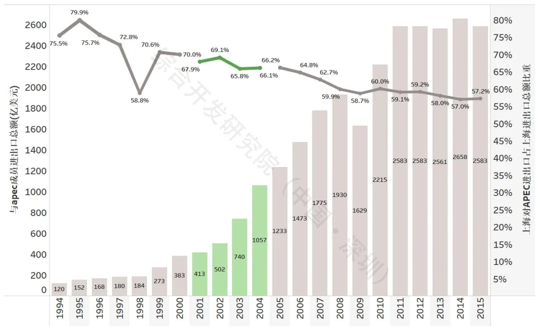 在贸易便利化领域,上海率先落实数字APEC战略,于2001年在全国率先启动“大通关”改革,成立上海亿通国际股份有限公司,建设上海大口岸物流信息系统(“大通关平台”),并以此为依托,于2004年承建由上海市与海关总署共建的全国第一个地方“电子口岸”,率先实施“提前报关、货到放行”模式,2005年成立上海口岸工作领导小组,为2014年启动建设国际贸易“单一窗口”奠定了先行基础。2003年,国务院批复设立全国首个“区港联动”的保税物流园区——上海外高桥保税物流园区,实现“一线放开、二线管住、区内自由、入区退税”。2001-2004年,上海市进出口总额从609亿美元增至1600亿美元,占全国比重由11.9%提升至13.9%,创历史巅峰;三年累计增长1.63倍,年均增长38.0%,其中与APEC成员贸易总额年均增长36.8%。
