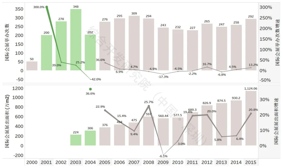 注:数据来源《上海市统计年鉴》。2001年国际会展数量为“国内+国际”会展数量的合计值,国际会展展出面积自2003年开始统计。