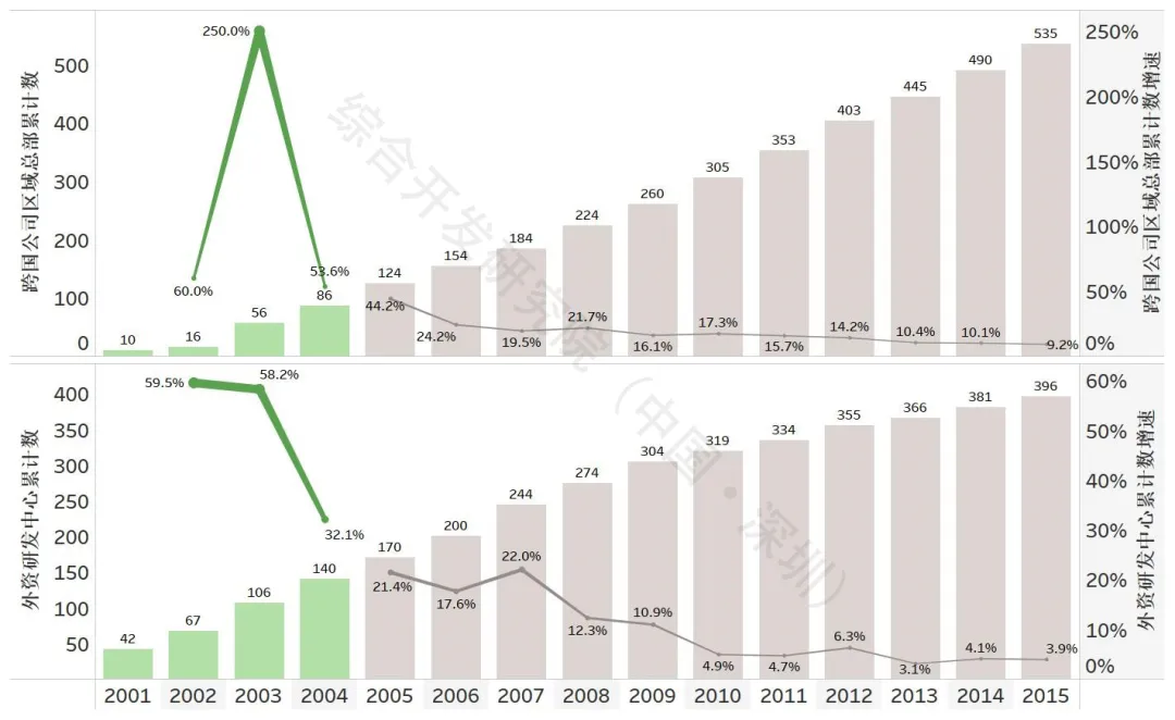 图4 2001-2004年上海跨国公司地区总部和外资研发中心规模及增速