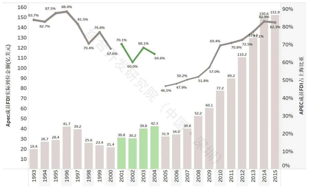 注:数据来源《上海市统计年鉴》,当时统计口径中的APEC成员仅覆盖中国香港、中国台湾、日本、韩国、新加坡、泰国、美国、加拿大、澳大利亚共计9个成员。