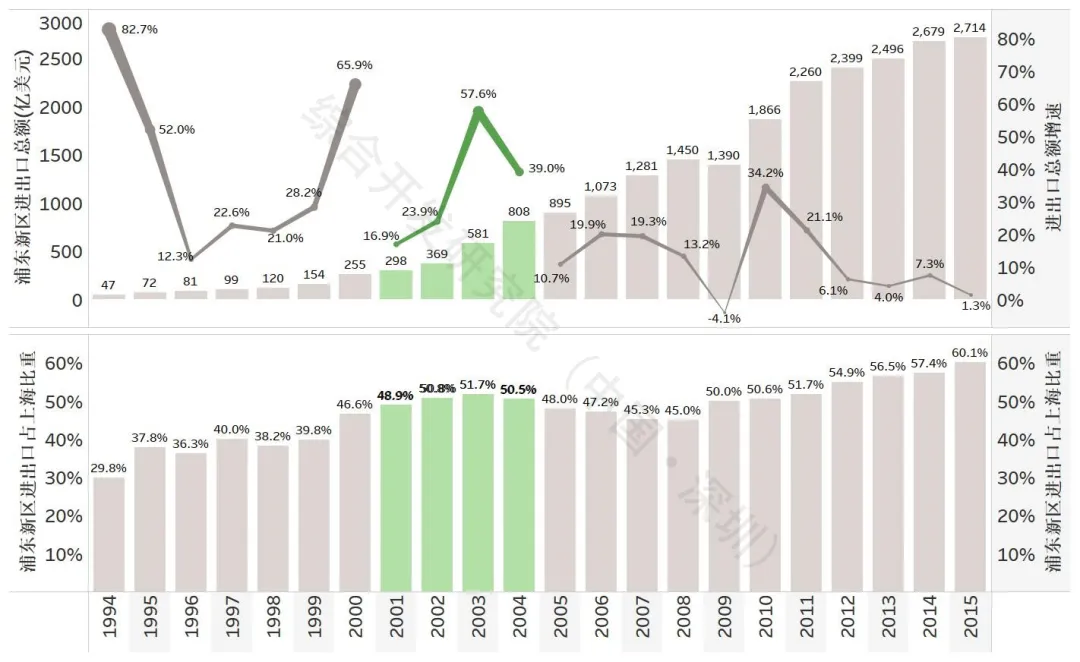 图3 2001-2004年上海及浦东新区进出口总额规模及增速、占比情况
