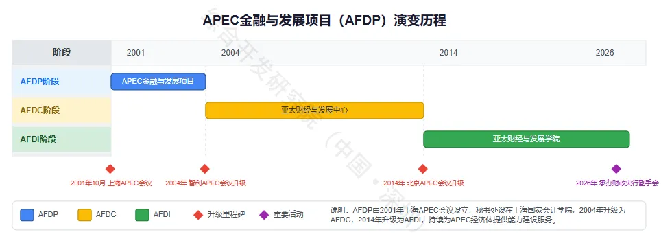 APEC金融与发展项目(AFDP)是我国落实“上海共识”,倡议设立的人力资源能力建设重要项目,世界银行为联合主办方,我国提供200万美元项目启动资金,APEC教育基金加以支持。AFDP包含高级金融与发展人才培训、APEC金融与发展项目年度研究报告和APEC金融与发展论坛,秘书处设在上海国家会计学院(与APEC金融与发展项目一体化运行)。项目成功试运行三年后,我国领导人在APEC智利会议上宣布在AFDP基础上成立亚太财经与发展中心(AFDC),拓展财经与发展领域能力建设的平台功能,并于2014年进一步升级为亚太财经与发展学院(AFDI)。
