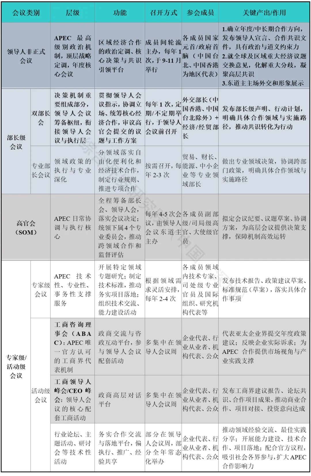 APEC年度会议体系包括领导人非正式会议和系列预备会议,其中系列预备会议又包括部长级会议、高官会、专家级/活动级会议三个层级,具体功能定位及举办机制见下表。