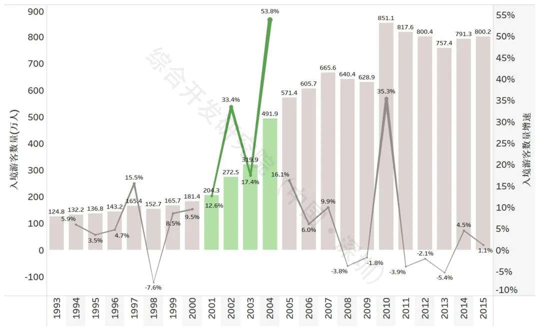 图8 2001-2004年上海入境游客数量、增速情况