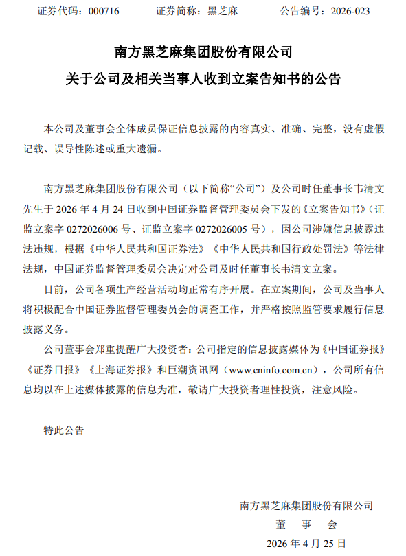 4月24日晚间,南方黑芝麻集团股份有限公司(以下简称黑芝麻)发布公告称,公司及时任董事长韦清文当日收到中国证券监督管理委员会(以下简称“证监会”)下发的《立案告知书》。因公司涉嫌信息披露违法违规,证监会依据《中华人民共和国证券法》《中华人民共和国行政处罚法》等相关法律法规,决定对公司及韦清文立案调查。