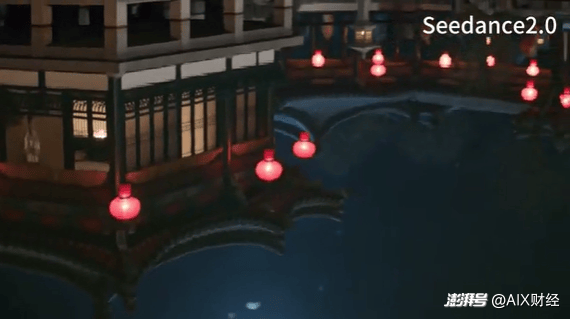 Seedance2.0的画面以人物为主体,叙事感最强。一队仕女缓步行进于水边长廊,服色错落有致,发髻整齐统一。镜头从水面倒影开始,逐步带出建筑、灯笼、再到行进的队列,信息密度层层递进。