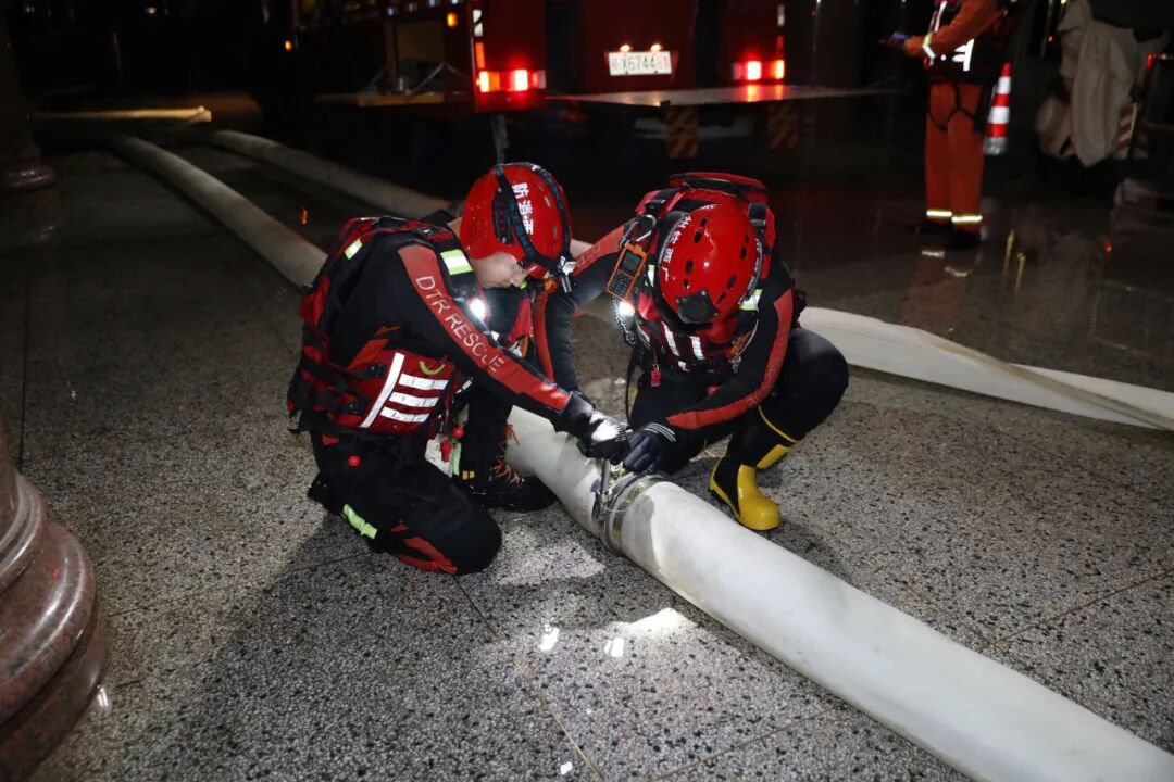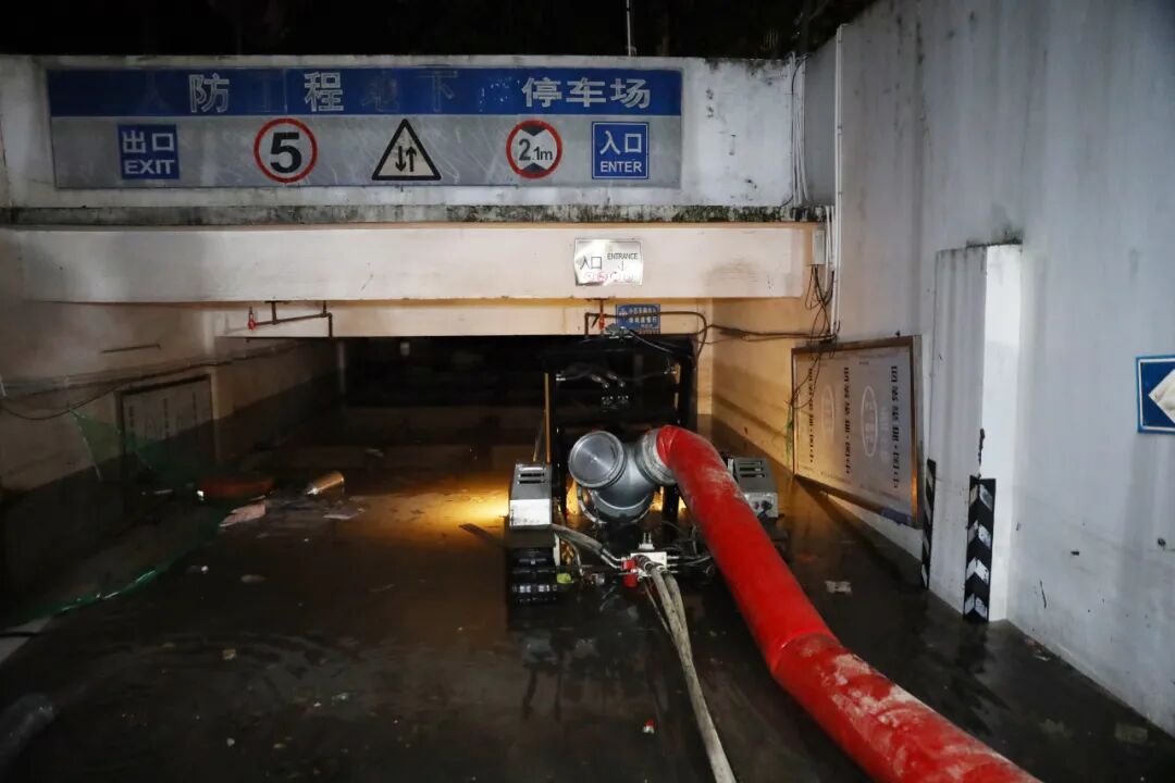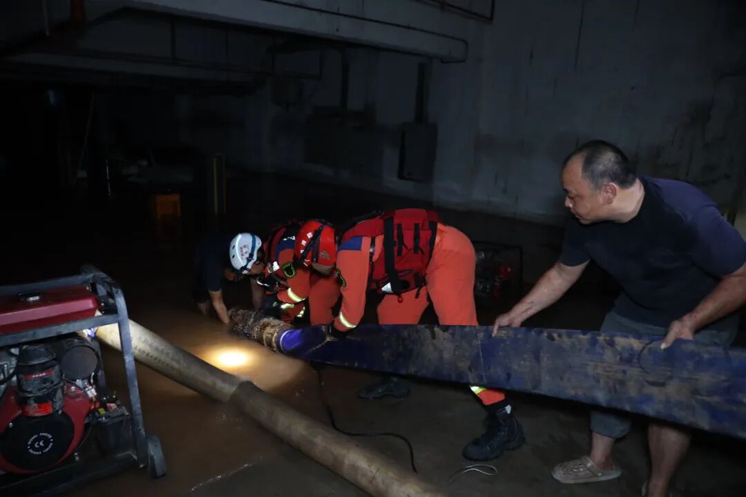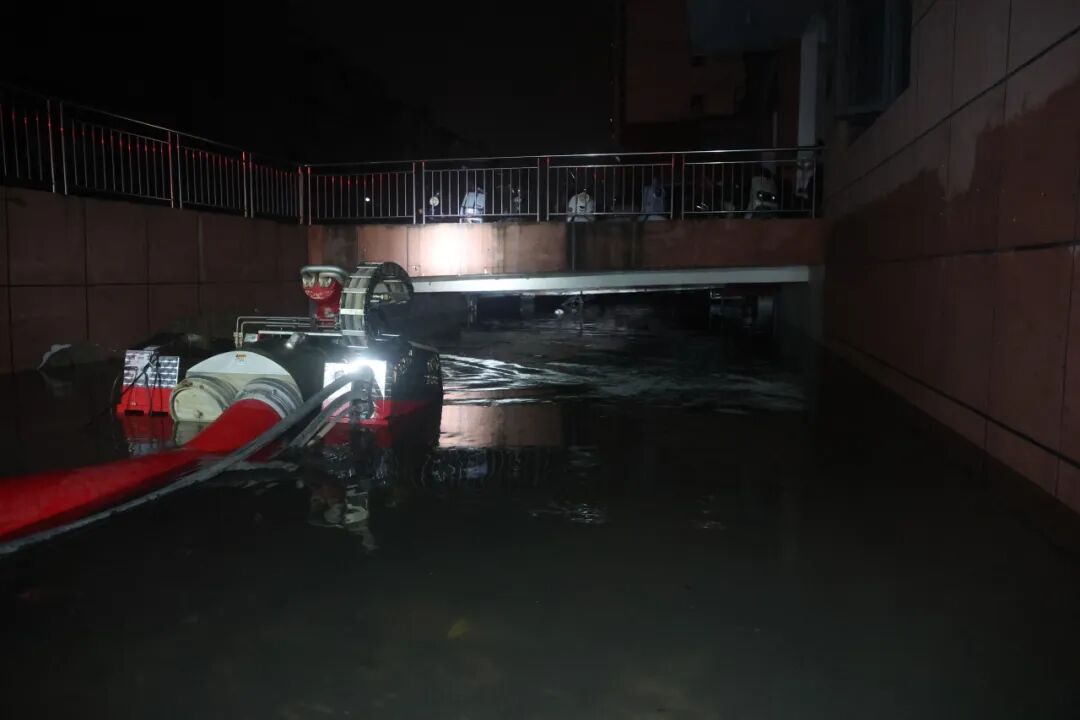在积水较为严重的宁越花园、银河雅苑等小区,地下车库已被完全淹没,积水最深处达1米,多辆私家车浸泡水中。消防救援人员抵达现场后,迅速勘察积水情况,第一时间架设手抬机动泵组展开不间断抽水作业。为加快排水效率,消防队员在浑浊的积水中摸索下水道口,清理堵塞的树枝、杂物等障碍物,确保排水通道畅通。