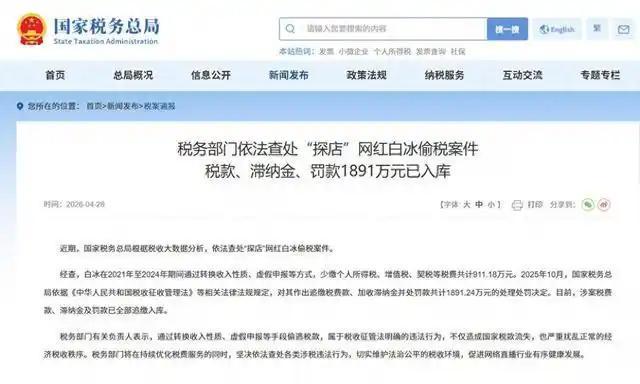 近期,国家税务总局根据税收大数据分析,依法查处“探店”网红白冰偷税案件。