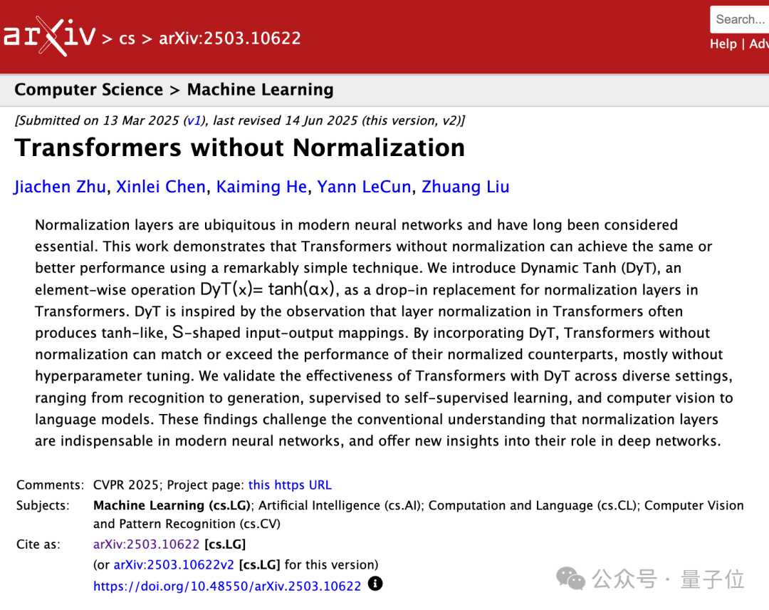 编者注:这里指的是2025年刘壮与Yann LeCun等人合作发表的论文《Transformers Without Normalization》。