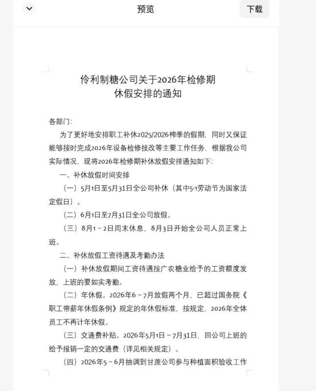 4月28日,上游新闻(报料邮箱:baoliaosy@163.com)记者从网帖配图看到,该企业为更好安排2025/2026榨季后的检修工作,在完成设备检修任务前提下,对员工实行集中补休放假。具体安排为:5月1日至5月31日为补休期(含法定节假日),6月1日至7月31日全公司继续放假(含年休假),8月初恢复正常上班。同时,文件还提到补休放假期间工资待遇按相关标准发放,并对交通补贴作出说明等。