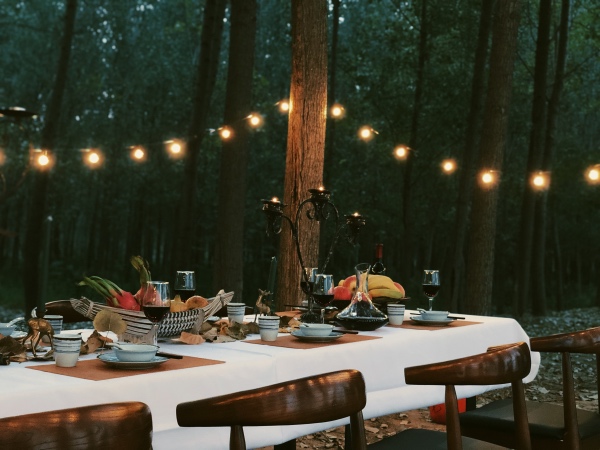黄河边的日落长桌晚宴是民宿的拿手好戏,四号院子旁边的小树林里,面向黄河,蜡烛点起,投影放的是《小森林》,阿姨端来家常菜,一直到太阳落山,星星升起,月朗星稀,这样的夜晚可以被记得很久。