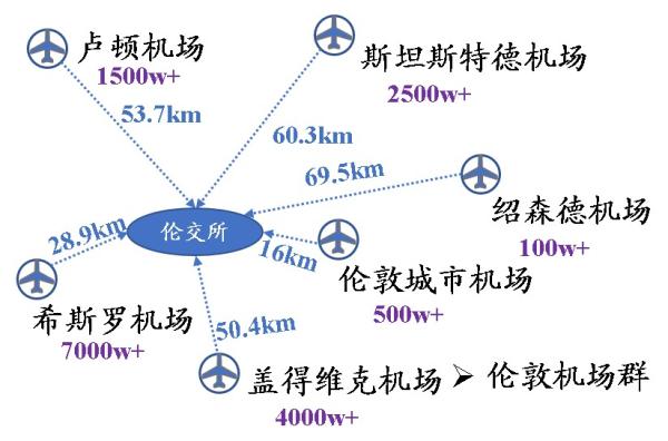 具体情况方面,希斯罗机场作为伦敦最著名、规模最大的门户枢纽机场,坐落于城市西南角30km处。伦敦城市机场坐落于泰晤士河上,距伦敦证券交易所仅16km。但由于跑道规模有限,一般多用于公务机的起降。而盖得维克、卢顿、斯坦斯特德、绍森德机场距离伦交所的距离都超过50km。