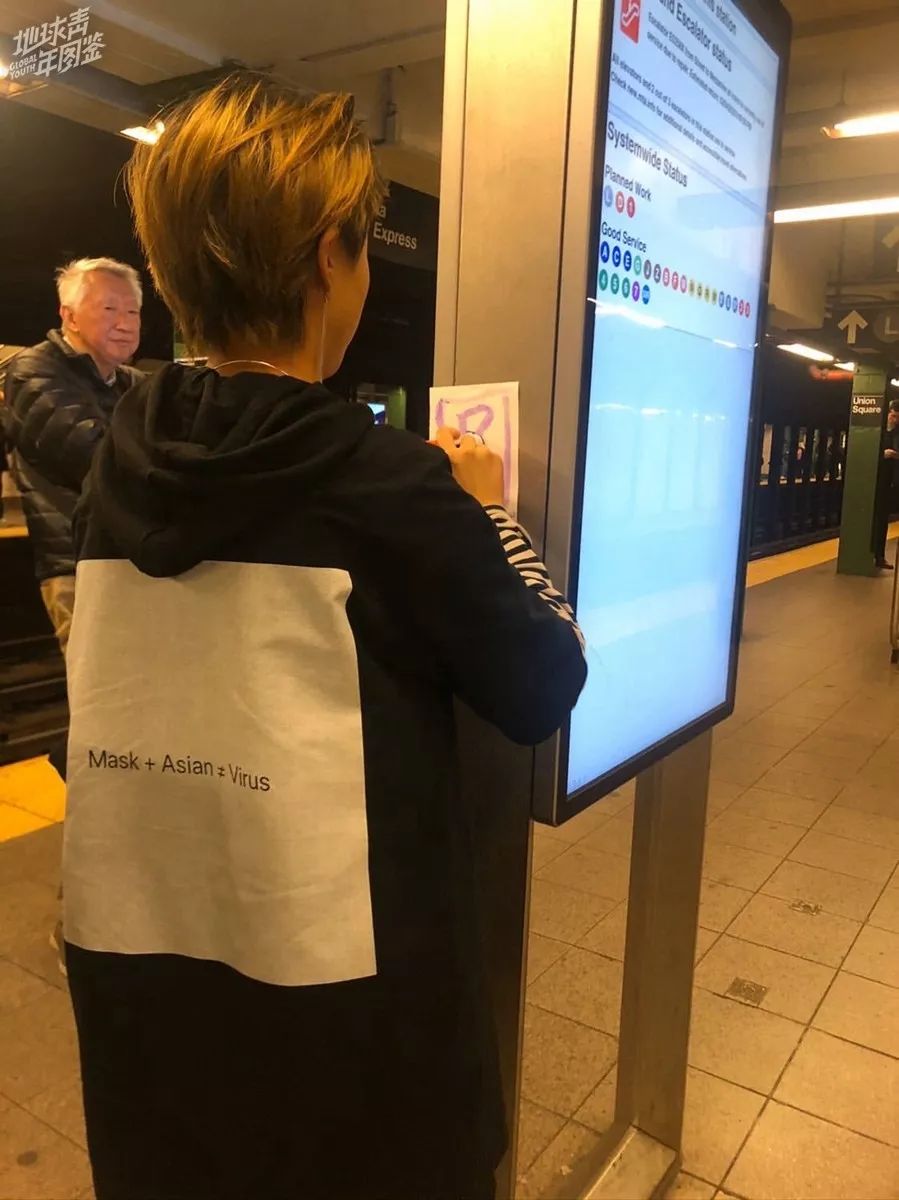 有了在纽约地铁的亲身经历后,杨飞霖又看到有几家外国媒体在头版头条直接使用“中国病毒”“黄祸”等词汇,她当时就想到“口罩+亚裔≠病毒”这句标语,她把标语印在T恤上,又打印了八九十张小海报,海报上加了一句“停止新形式的种族歧视”,当天晚上就穿着T恤到地铁里去贴海报了。