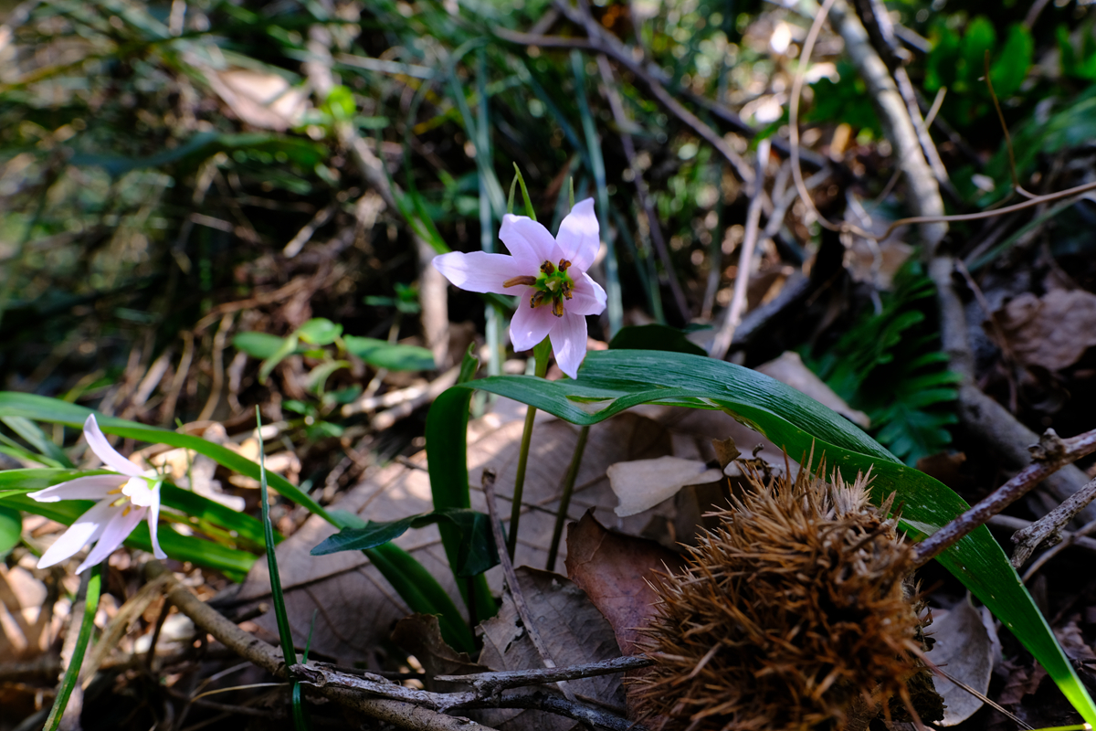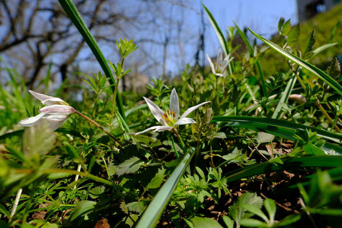 我惦记着老鸦瓣,一路寻去,果然又在往年见过的老地方发现了它们,已有少数植株开花了。老鸦瓣属于百合科,原先被划入郁金香属,前些年被划入单列的老鸦瓣属,花形跟郁金香有点相似。老鸦瓣的叶子细长碧绿,状如韭菜;状如花瓣的花被片为白色,背面有紫红色条纹,清丽素雅,气质宛如小家碧玉。