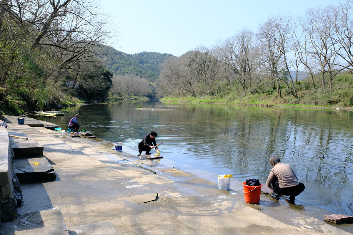 拜访完这些老朋友,我走到河埠头,放下摄影包,坐了下来。几名村里的妇女在一旁洗衣,捣衣之声不绝于耳。河水清浅,无声地流过。白鹡鸰与红尾水鸲在水中石头上跳来跳去。不远处,五六只小䴙䴘在水面上悠然自得地游动,岸上稍有动静,就一起踏波奔逃而去。