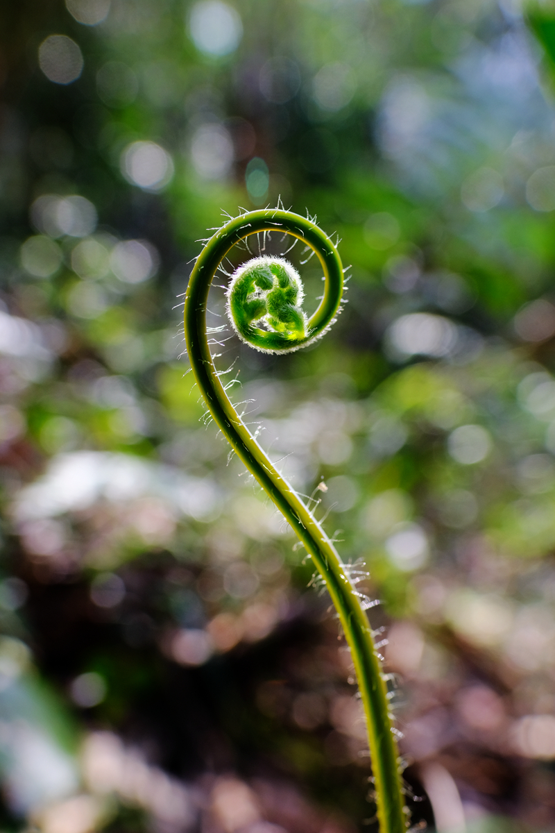 蹲下来拍花的时候,注意到草丛里有不少刚萌生的嫩蕨,其造型甚似握紧的小拳头,而且毛茸茸的,非常可爱,让人不由自主地感受到新生命的美好。