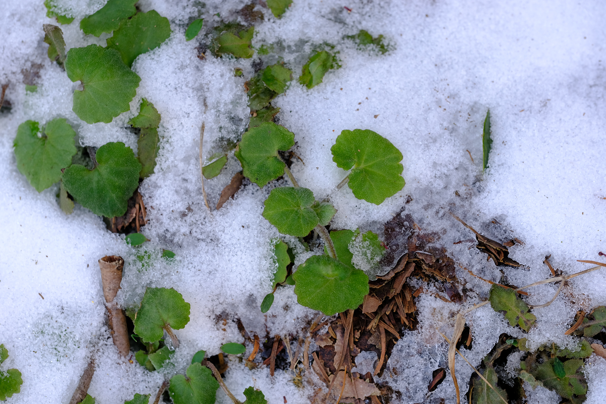 背阴处的山坡上,两天前下的雪犹未融化。蹲下来轻轻一摸,方知这雪触感很硬,更像是冰。薄薄的冰雪,盖不住碧绿的春草。这种草的叶子很好看,圆如荷叶,多白色绒毛,有点像虎耳草。岩石下面悬挂着成排的冰凌,短者20多厘米,长者超过1米,晶莹剔透,实在美极了。