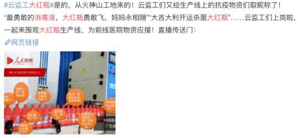 自雷神山、火神山建成后,告别叉酱、蓝忘机和呕泥酱,46万网友火速发现了新的云监工项目——“大红瓶”立白威王84消毒液生产。而这批消毒液正是由立白集团及其控股朝云集团向前线捐赠的2亿物资。
