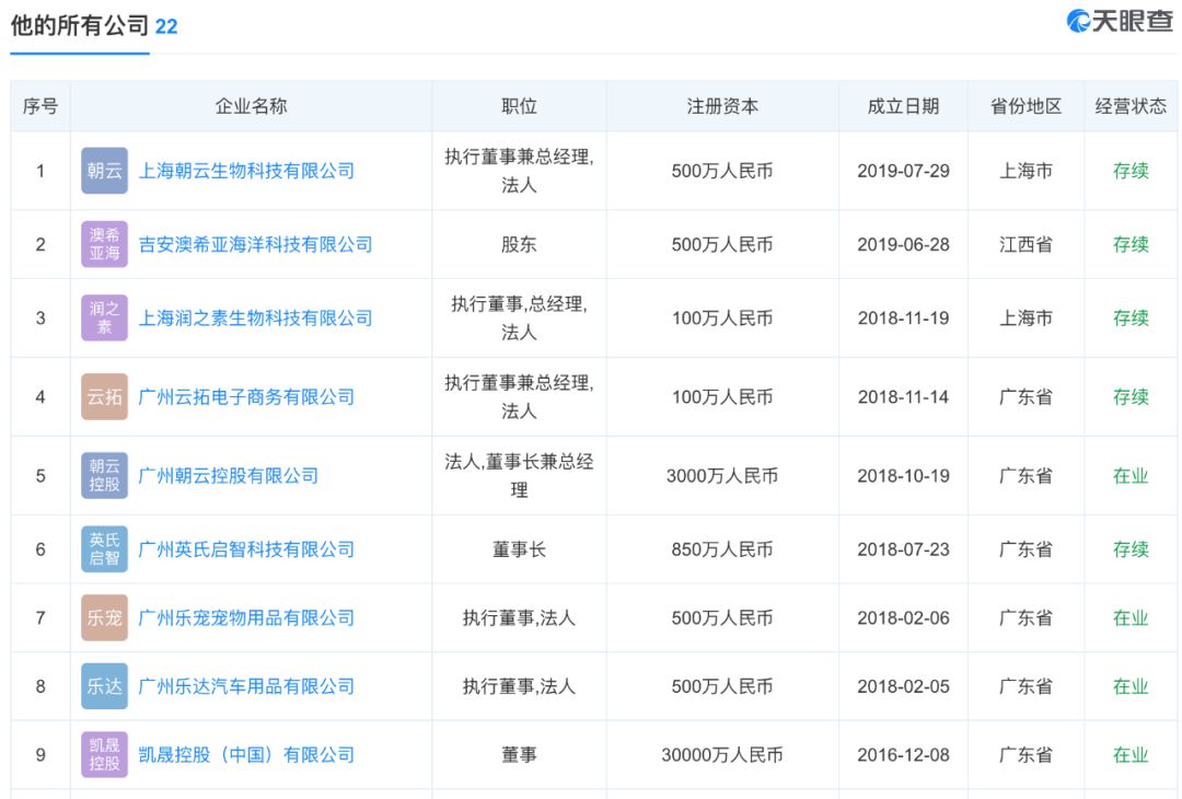 至此,陈丹霞已有7个头衔加身,包括中国美容联盟主席、中国化妆品零售业执行主席、上海高姿化妆品董事长、广州超威日化董事长、广州立白公司董事。不止于此,天眼查显示,陈丹霞手握22家公司,其中有2家已处于注销状态。
