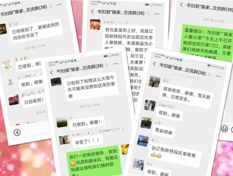 “已收到暖心菜了,我想这么大雪今天不能来,没想到还是送来了,谢谢!”“雪天路滑,注意安全啊”……句句暖心的话语,是赴武汉防疫一线医护人员家属收到新鲜有机蔬菜和香米后,在微信群里发出的由衷谢意,同时也表达了家属们在寒冷的天气里足不出户收到菜米的喜悦心情。