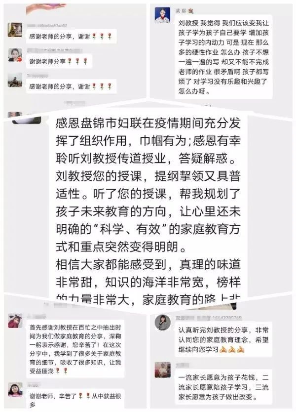 疫情期间,盘锦市妇联搭建家庭教育“空中课堂”,邀请家庭教育讲师团成员、家庭教育志愿者,采取微信直播授课方式,每天为群内家长送上一堂“家庭家教家风”建设教育讲座,组织家长与老师进行在线交流,分享学习心得体会。