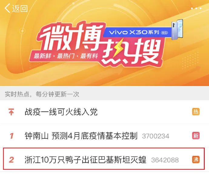 今天,一条内容为“浙江10万只‘鸭子部队’可能代表国家出征巴基斯坦灭蝗”的新闻登上了微博热搜榜。