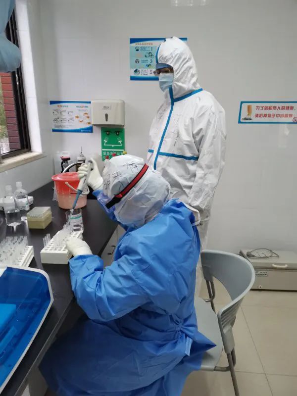 在郭队、李强老师和其他检验队员的齐心协作下,汉口医院检验科的硬件设施逐步完善,检验工作量增加,2月中旬我开始进入检验科工作。因防护服比较紧张,我们一穿上就尽量多做些工作。几天下来,我的额头、鼻翼和后背因长时间被汗水浸湿,冒出很多小痘。跟老公视频,开玩笑地说,我逆生长了,又开始长青春美丽痘啦!