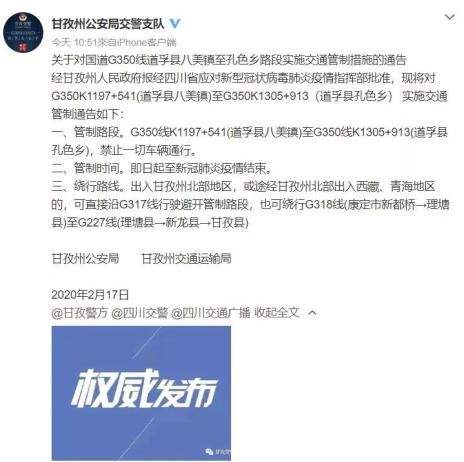 一、管制路段。G350线K1197+541(道孚县八美镇)至G350线K1305+913(道孚县孔色乡),禁止一切车辆通行。
