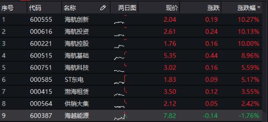 此外,海航基础一度触及涨停、海航科技、ST东电、渤海租赁涨幅超过3%,海航系全部A股公司中,仅有海越能源出现下跌。