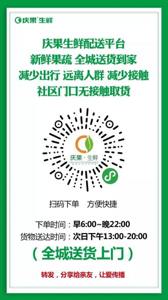 (一)下单平台:微信公众号搜索“庆果生鲜连锁”、微信小程序搜索“庆果”。