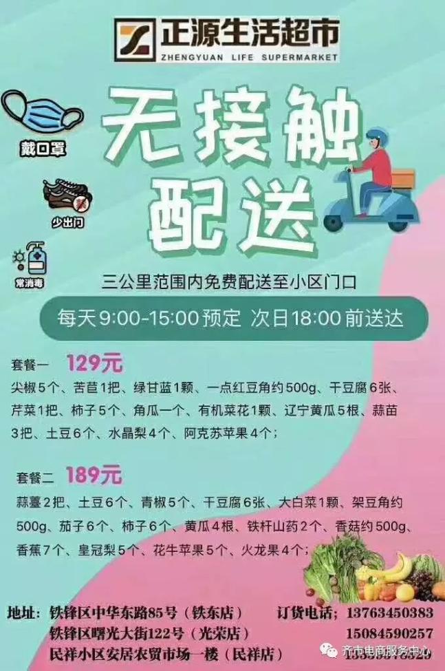 为切实做好疫情防控工作,在疫情防控工作期间,龙沙区大满贯超市提供线上预订线下无接触配送,配送单位为齐齐哈尔市北三区,购物满200元起配送,配送费5元/次,配送时间从2月11日开始,为上午10:00-12:00,下午3:00-4:00。