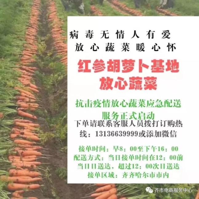 为抗击疫情,保证市区内蔬菜水果供应,梅里斯区红参胡萝卜基地现正式启动放心蔬菜线上预订应急配送服务,配送范围为齐齐哈尔市北三区。详情请咨询红参胡萝卜基地。