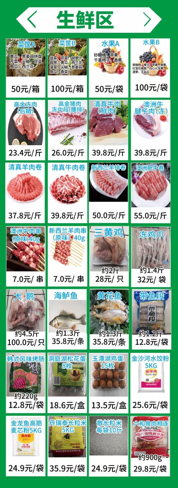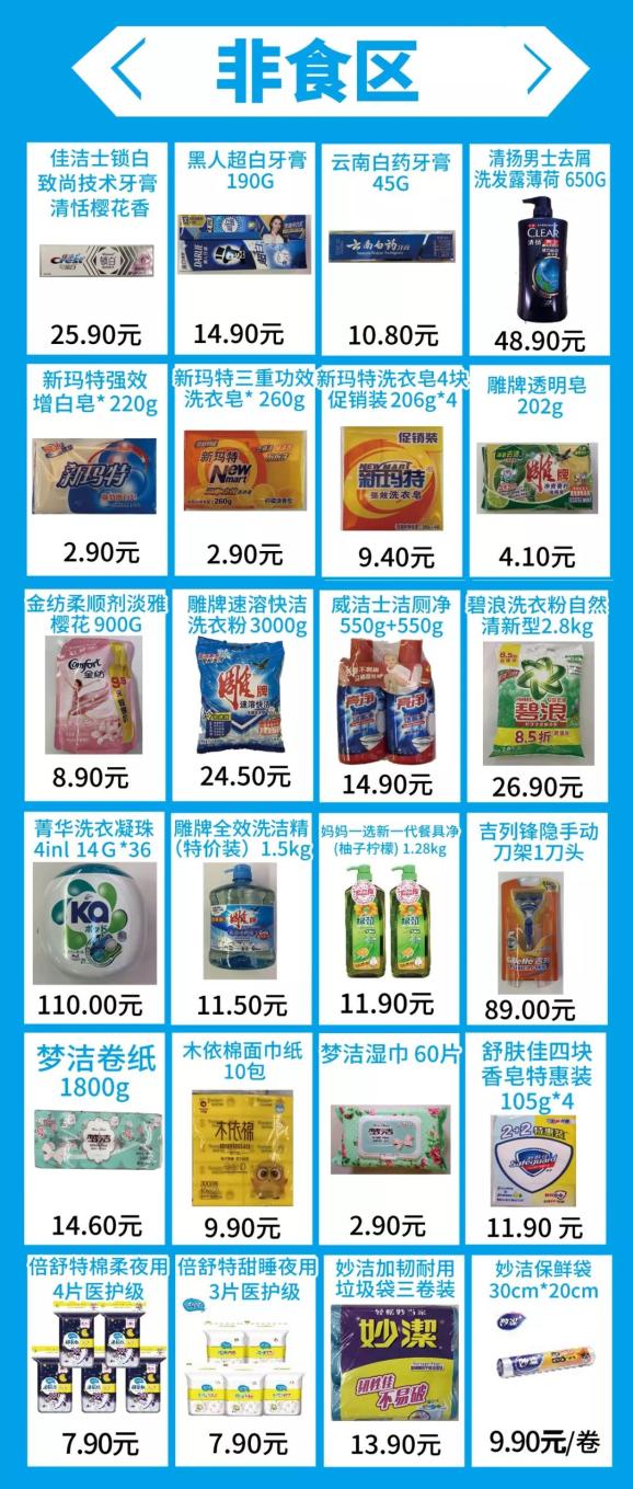 ★销售品项涵盖:时令水果,新鲜蔬菜,肉禽水产,熟食面点,酒水饮料,粮油调味,美护百货,休闲零食等