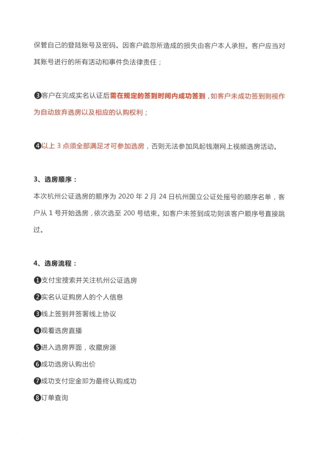 根据《认购须知》,本次选房签到时间为29日10时30分~12时40分,客户需在杭州公证选房线上系统按规定签到时间内成功签到,否则视为自动放弃选房资格;选房时间自当日13时00开始,1~200号客户按先后顺序依次选房,每位客户至多拥有5分钟选房时间。