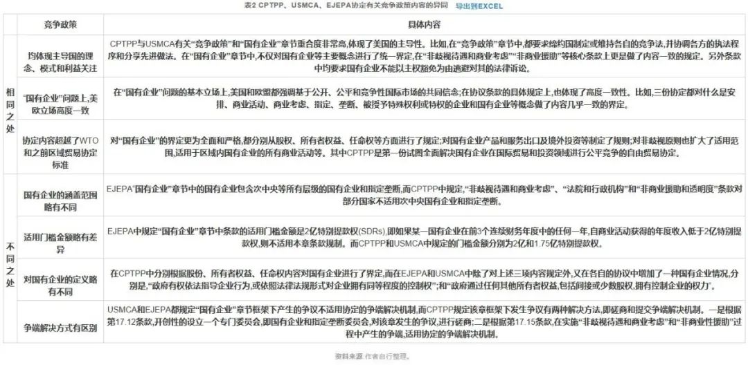 通过对比CPTPP、USMCA和EJEPA协定的格式、体例和具体的文本内容,分析出三份协定有关竞争政策内容在价值导向、实施标准等方面的异同(见表2)。