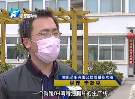 博凯药业有限公司质量技术部经理 李跃克:复工之后我们主要是开通了两条生产线,一个是84消毒泡腾片的生产线,一个是75%的酒精消毒生产线。供不应求,在采买原料、运输、用工这些方面都得到了当地乡镇、县政府的大力支持、帮助。