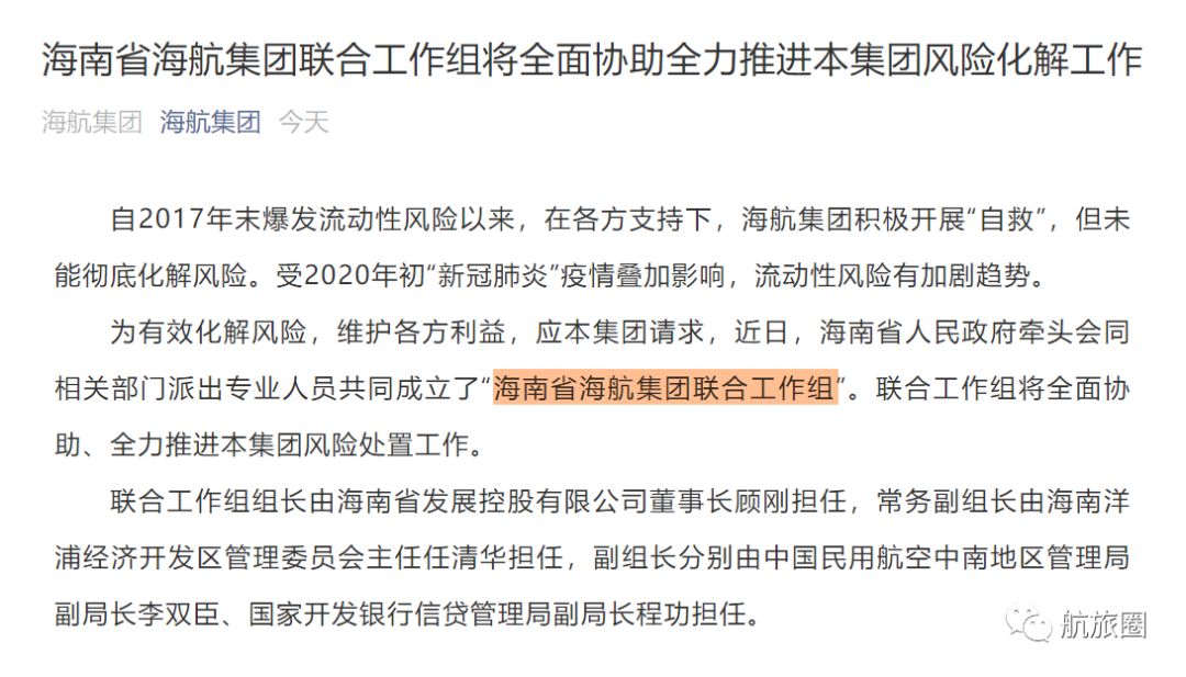海航集团官网刚刚发布消息:为有效化解风险,维护各方利益,应本集团请求,近日,海南省人民政府牵头会同相关部门派出专业人员共同成立了“海南省海航集团联合工作组”。联合工作组将全面协助、全力推进本集团风险处置工作。