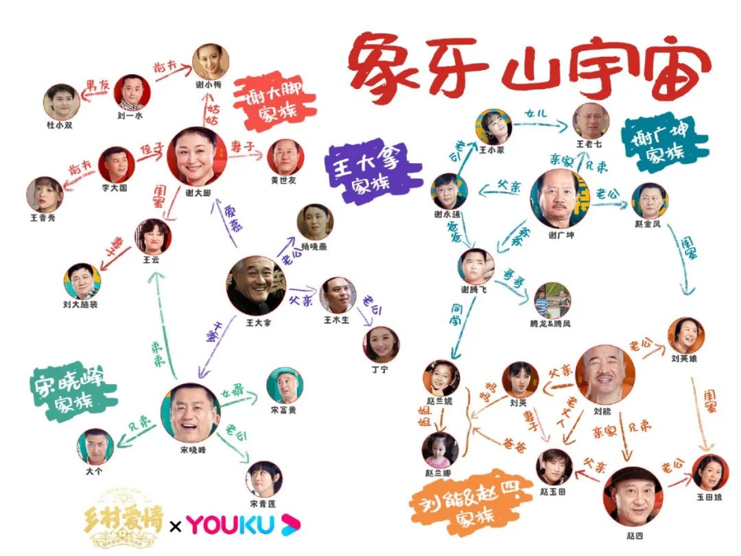 电视剧以角色为本,乡爱系列的持久,很重要的一点原因是刻画出了一个个深入人心的角色,即便没有看过,也会从各种短视频与表情包里了解到烦人的老公公谢广坤,表情包大户谢腾飞,磕磕巴巴的光头刘能,亚洲舞王赵四,中年村花大脚婶……他们性格各异,生动真实,创造出别具一格的幽默和自己“宇宙”中的自洽。