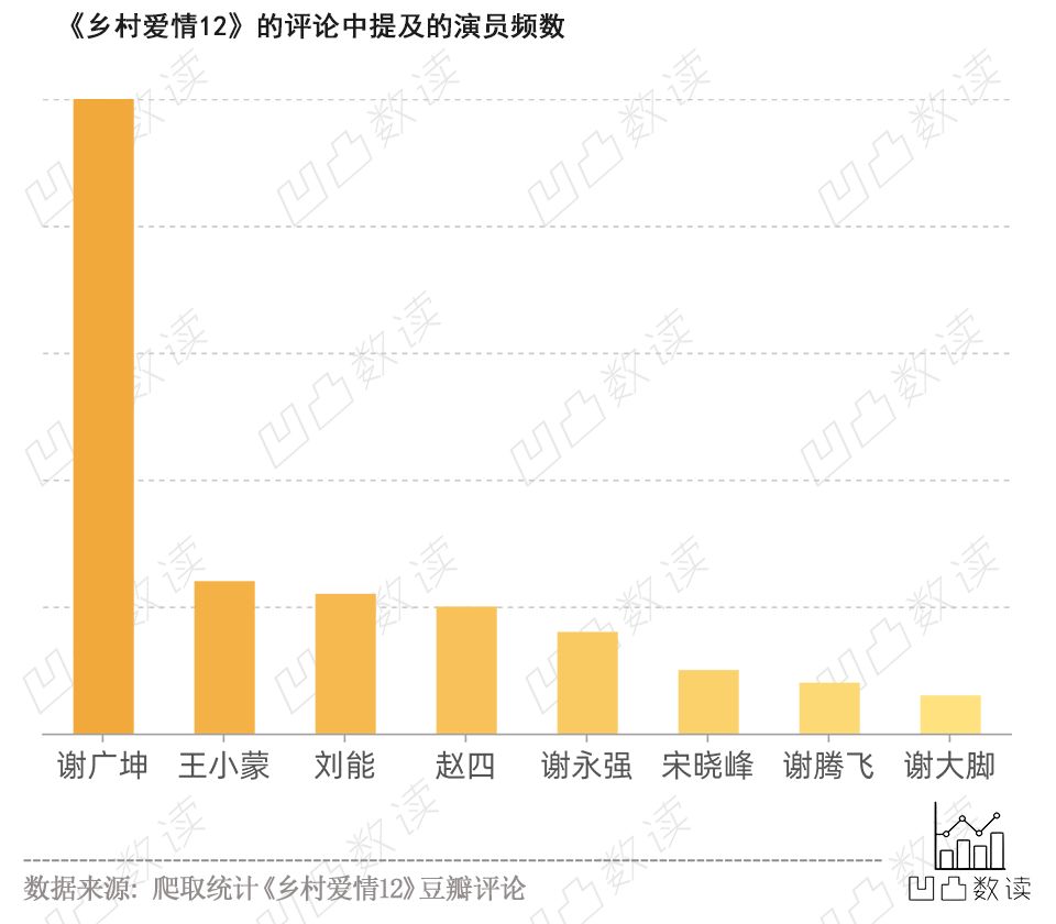 在《乡爱12》豆瓣评论提及的角色频率前8名中,谢广坤的“人气”也是一骑绝尘,和王小蒙、谢永强、谢腾飞这一家子的名字也占据半数。