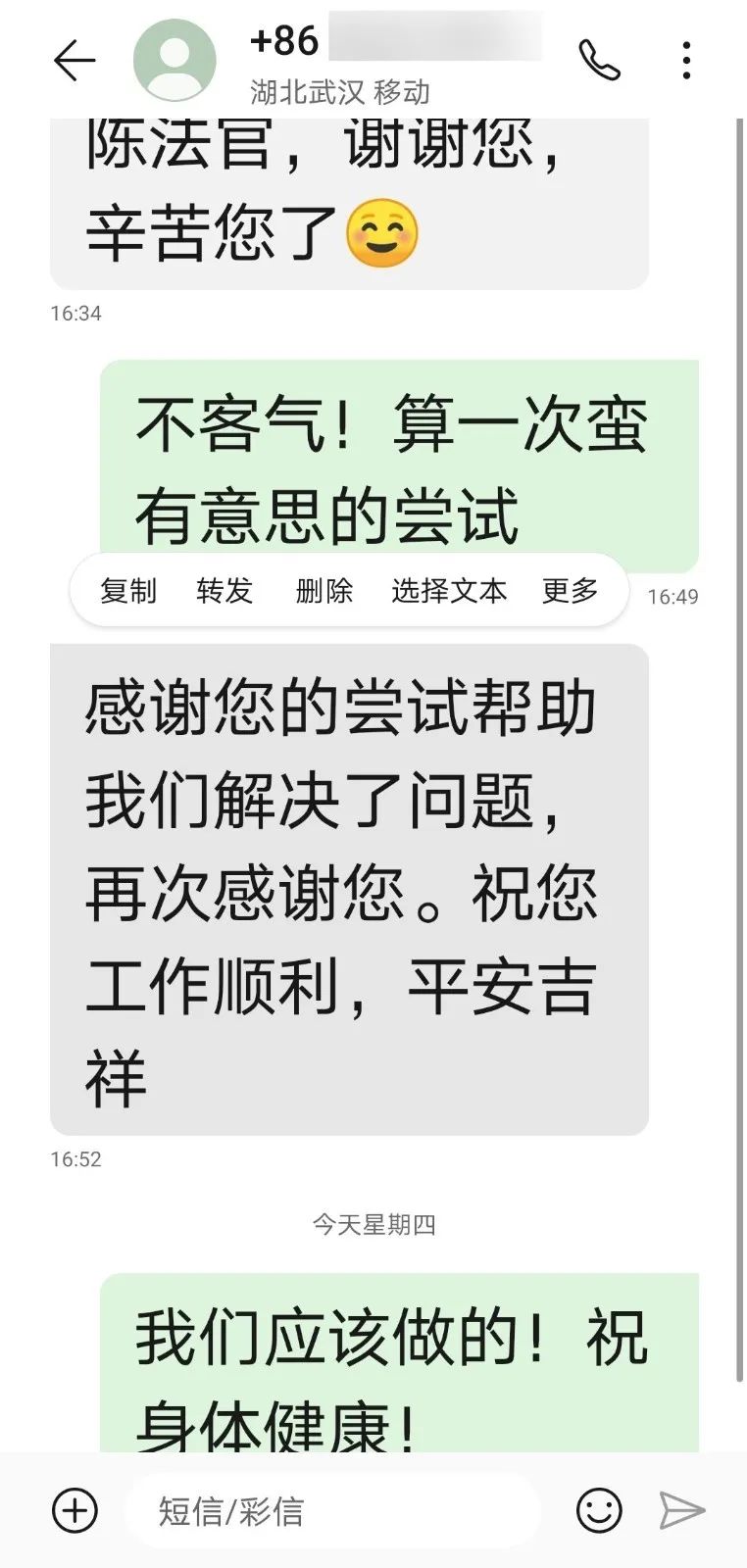 调解结束后,原告代理人以及第三被告以短信、电话的方式向陈法官致谢,认为线上调解的方式充分考虑到了疫情期间法官与当事人的难处,而且操作便捷,很好地解决了他们的燃眉之急。