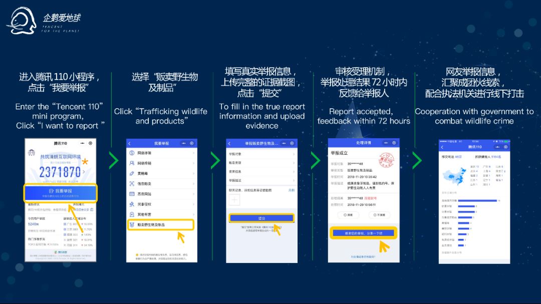 面对严峻的犯罪态势,为了利用科技更好地打击犯罪,林业执法部门和一些社会公益组织都开通了涉及珍贵、濒危野生动物违法、犯罪活动的举报平台,腾讯就是其中典型的代表。