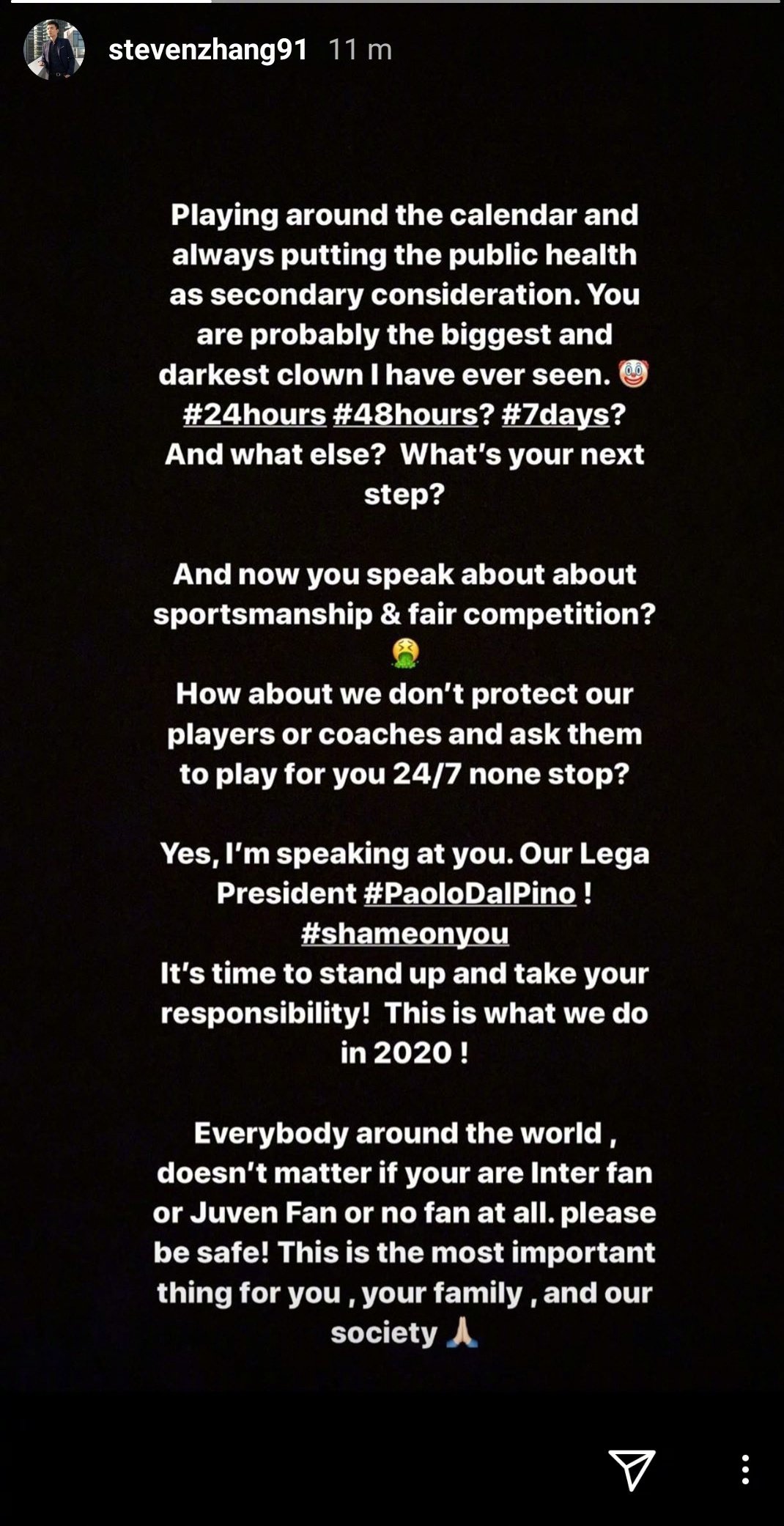 从他的发言看,除了对国米的赛程不满之外,他认为以主席达尔皮诺为首的意甲联盟并不称职,在不断调整赛程的过程中,压根没有真正在意公众的健康,只是假“防控疫情”之名来搪塞: