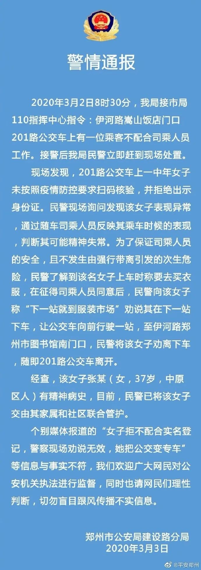 现场发现,201路公交车上一中年女子未按照疫情防控要求扫码核验,并拒绝出示身份证。民警现场询问发现该女子表现异常,通过随车司乘人员反映其乘车时候的表现,判断其可能精神失常。为了保证司乘人员的安全,且不发生由强行带离引发的次生危险,民警了解到该名女子上车时称要去买衣服,在征得司乘人员同意后,民警向该女子称“下一站就到服装市场”劝说其在下一站下车,让公交车向前行驶一站,至伊河路郑州市图书馆南门口,民警将该女子劝离下车,随即201路公交车离开。