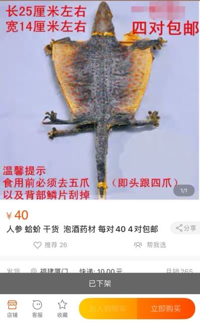“一周前,我们收到很多网友反映,在国家明令禁止野生动物交易后,阿里巴巴旗下平台淘宝网和闲鱼app以及京东、拼多多上都有在卖国家二级保护动物大壁虎(俗称蛤蚧)的相关制品,而且一些商家销售量不小。”回归荒野环境保护志愿组织负责人张晓磊告诉记者。