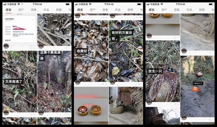另一位志愿者还摸索出了快手上野生动物交易的暗语体系,如不会直接发猎物的视频,而是让下好的猎夹露出一下,或者发一句“上山了”,拍一个山里的镜头,写一句隐晦的“高速收费站建好了”,意思实际上是野生动物从这里经过要收过路费,他们已经埋伏好猎夹、猎套,“已收费”的意思是“中货了、捕到猎物了”。“懂的人自然懂。”他说。