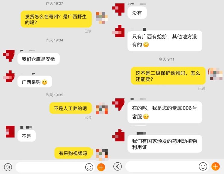 记者在搜索中还发现一个问题,当在旺旺中问店家“这不是国家二级保护动物吗,你们怎么还卖?”时,店家会告诉你:“我们有国家颁发的药用动植物证。”“林业部门发放的野生动物驯养繁殖许可证、经营利用许可证,在一定程度上支持鼓励着野味消费,导致‘合法’野味大行其道,但这些‘合法’野味中的大多数,有可能背后都是盗猎所得。但因为有证,所以很难查,很难打击。”一位业内专家表示。
