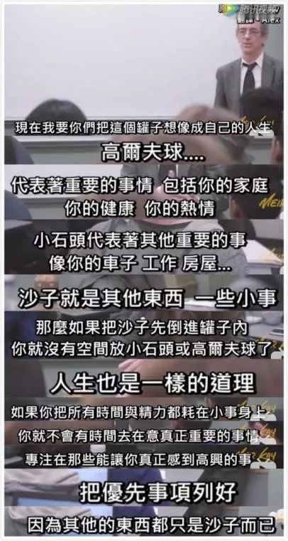 这个视频很经典,是一位哲学系的教授用高尔夫球、石头、沙子和水让人理解什么是人生重要的事,以及如何安排好优先级。